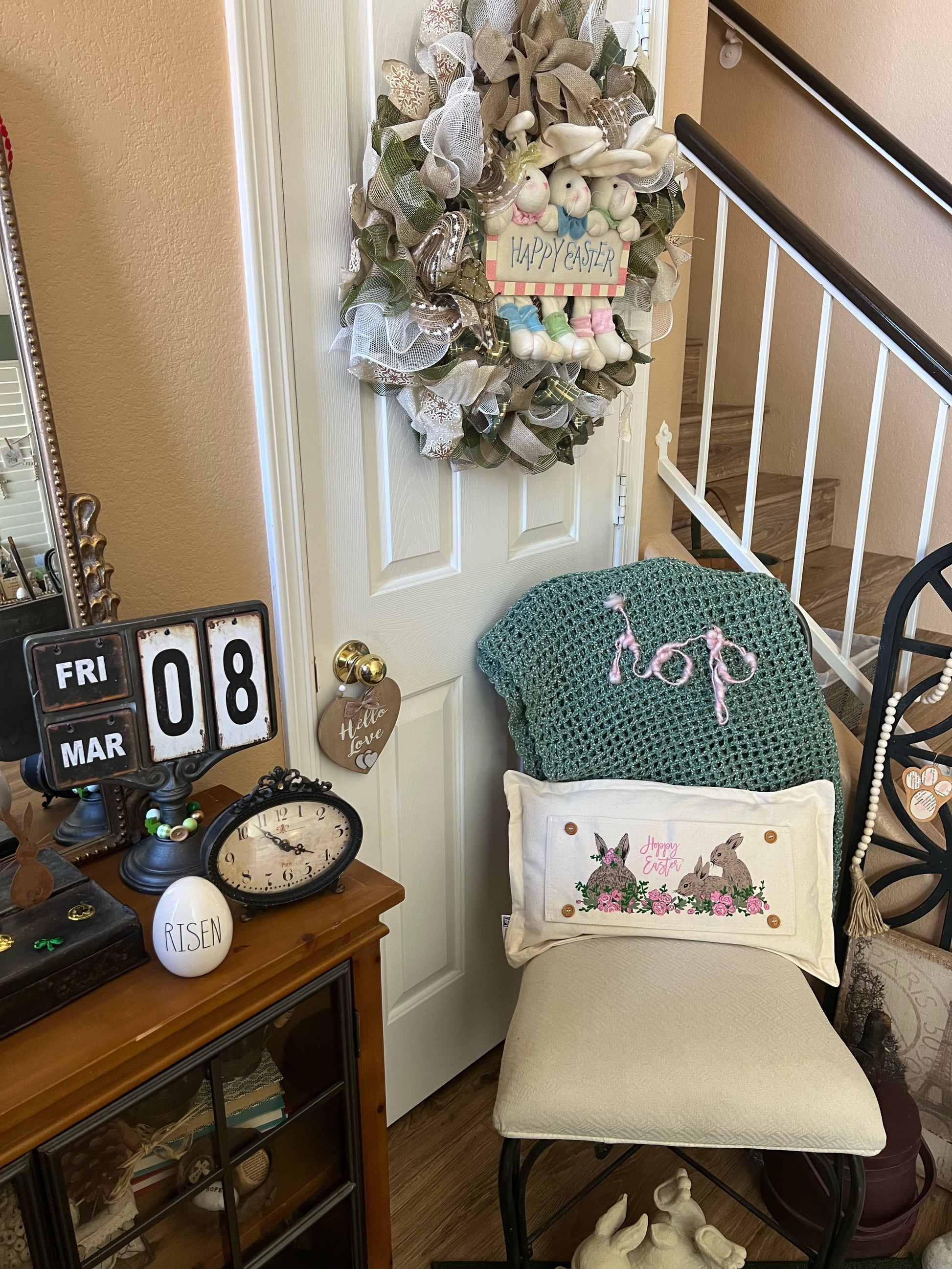 Coordinate pillows together in the same room or in different areas, on the porch, on a bench... on a mantel!Β I have one on my entry bench, 2 on my mantel, and one on my recliner to give the whole spring theme! All that enter say that my home is so, so cute... (I wink and say "with very little work..lol)