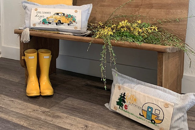 The flowers are starting to bloom! Coordinate pillows together in the same room or in different areas, on the porch, on a bench... on a mantel! I have one on my entry bench, 2 on my mantel, and one on my recliner to give the whole summer theme! All that enter say that my home is so, so cute... (I wink and say "with very little work..lol)