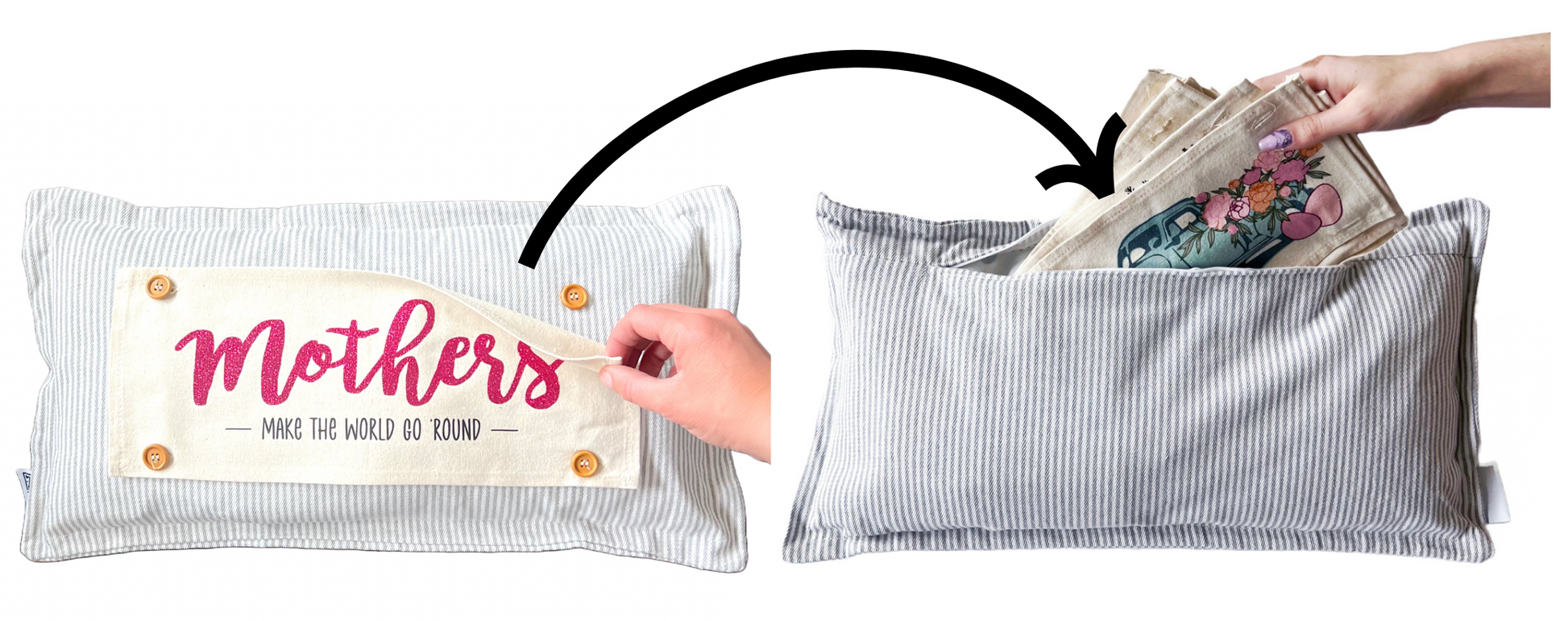 Get mom something unique that she won't EVER store away! She won't have to drag totes out of the garage or closets to decorate anymore with our convenient pillow panels that just store in the back zipper pocket and stay out all year!