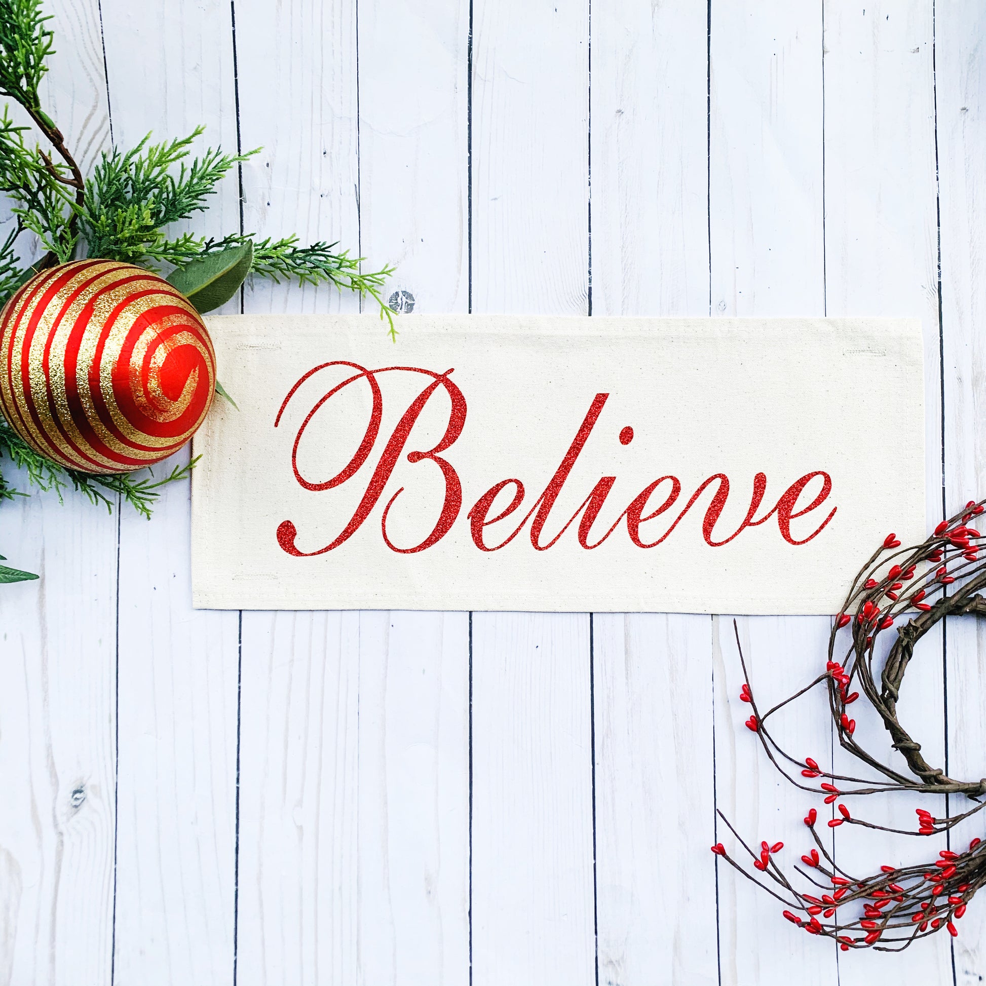 Glitter Holiday Panel: Winter, Christmas; CURSIVE SCROLL RED BELIEVE
